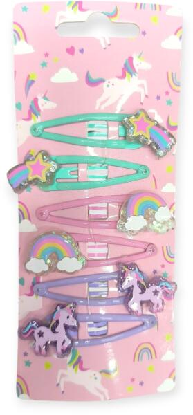 Leírás: Ez a különböző színű fém hajcsatkészlet 3D unikornis, szivárvány és csillag mintával igazi álom minden kislány számára. Vidám, színes dizájnjával feldobja a mindennapi frizurát, tökéletes iskolába, játékhoz vagy akár ünnepi alkalmakra is.